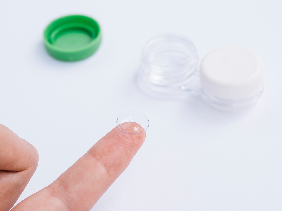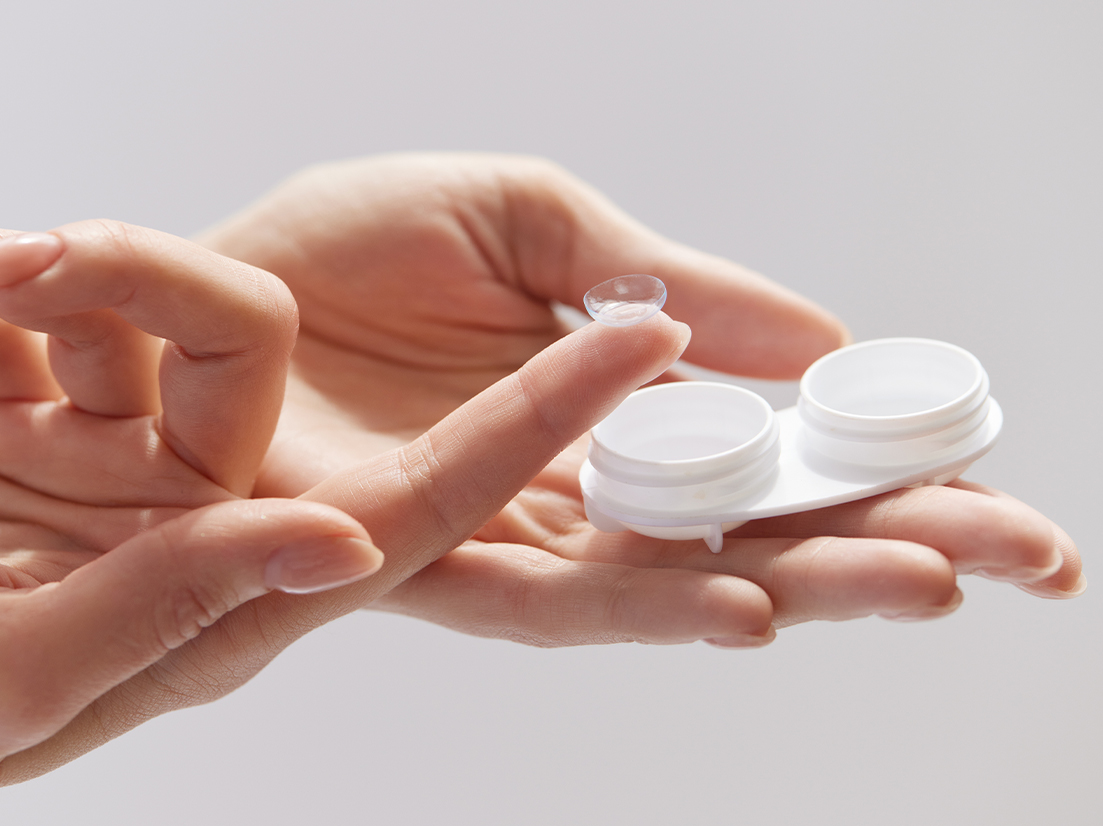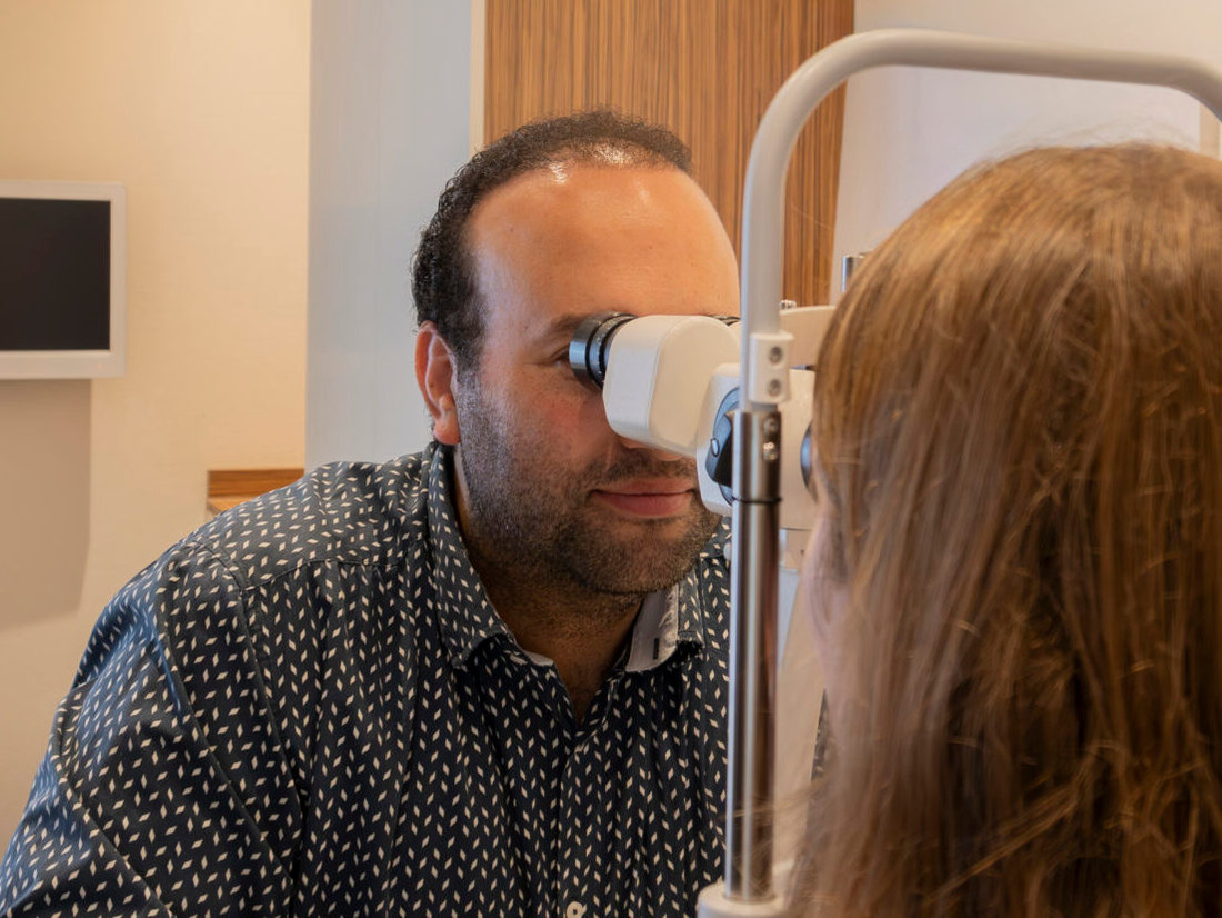 De optometrist controleert de passing van de lens, bekijkt de gezondheid van het oog en de sterkte wordt nagemeten.